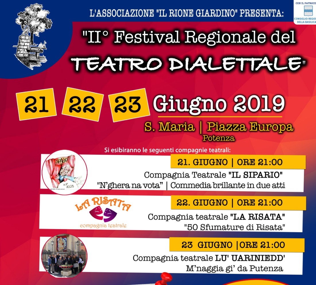 II festival regionale del Teatro dialettaleSpettacoli all’aperto e stands gastronomici ed espositivi21 – 22 e 23 giugno 2019, ore 21.00Piazza europa Santa Maria
