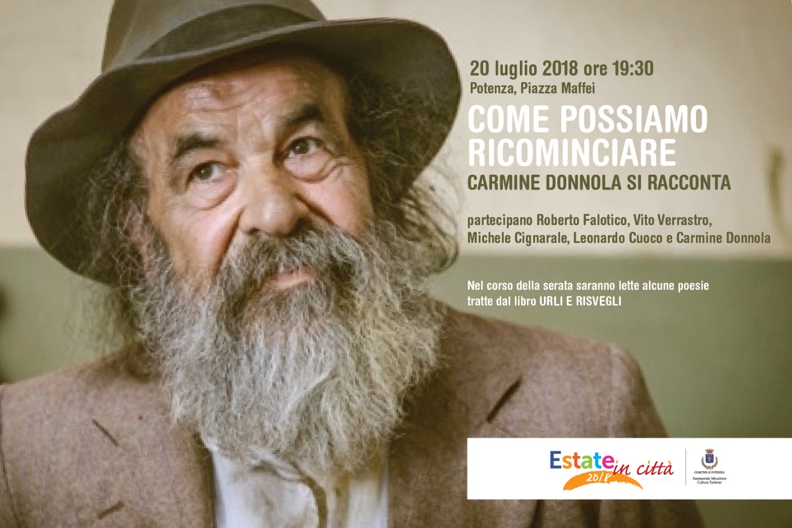 Carmine Donnola si racconta Nel corso della serata saranno lette alcune poesie tratte dal libro “Urli e risvegli” 20 luglio 2018, ore 19.30 Piazza Maffei …