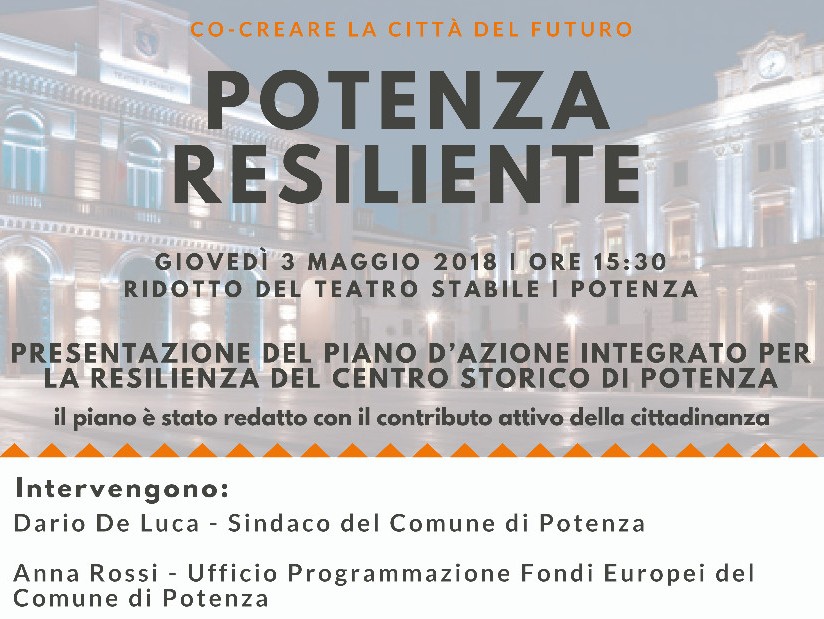 Presentazione del piano di azione integrato per la resilienza del centro storico di Potenza 3 maggio, ore 15.30 Ridotto teatro F. Stabile, piazza Mario Pagano …