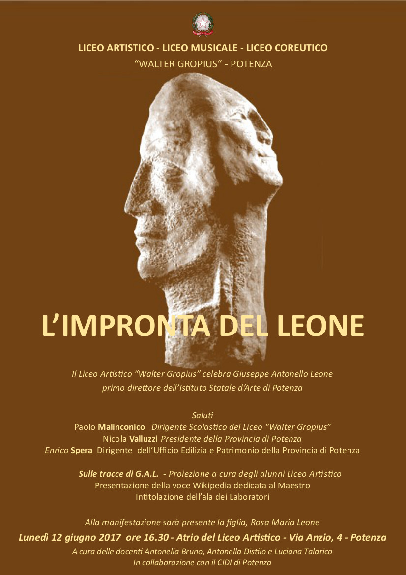 Il Liceo Artistico “Walter Gropius” celebra Giuseppe Antonello Leone, primo direttore dell’Istituto Statale d’Arte di Potenza Lunedì 12 giugno 2017 ore 16.30 Atrio del Liceo Artistico …