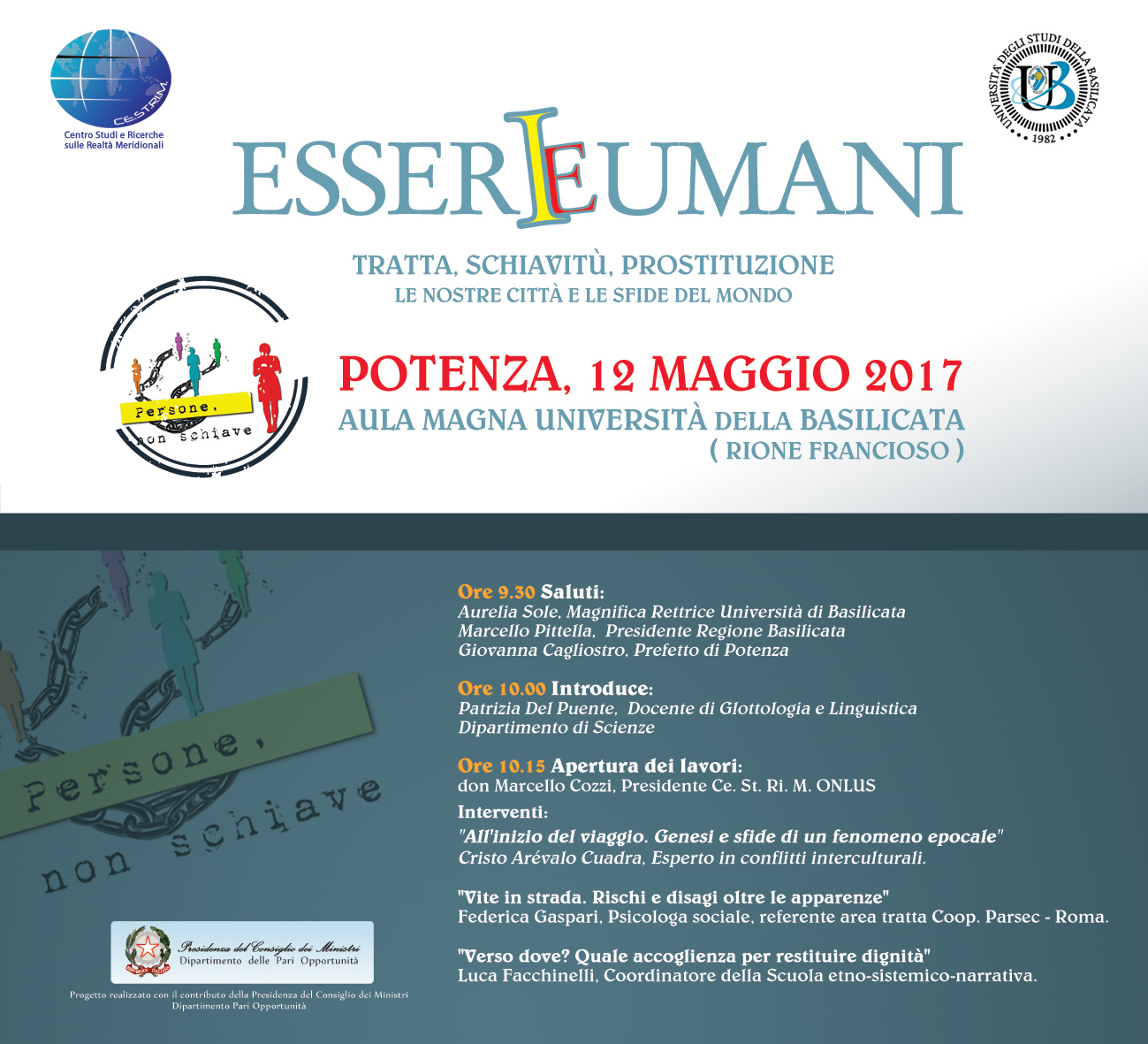 “Esseri umani Essere umani. Tratta, schiavitù, prostituzione. Le nostre città e le sfide del mondo” Venerdì 12 maggio 2017 Aula Magna dell’Università della Basilicata (Rione …