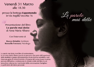 “LE PAROLE MAI DETTE” di Anna Maria Albano Venerdì 31 marzo, ore 18.30 Bottega Equomondo, via Angilla Vechia, 76 – Potenza Intervento di Rocco Brindisi …
