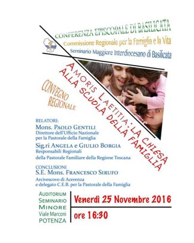 Convegno regionale Amoris Laetitia: la chiesa alla scuola della famiglia Venerdì 25 novembre 2016, ore 16,30 Auditorium del seminario minore, viale Marconi – Potenza Locandina Comunicato stampa