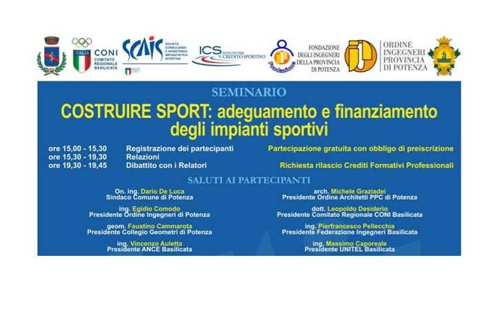 Costruire sport: adeguamento e finanziamento degli impianti sportivi Martedì 29 novembre 2016, ore 15.30/1945 Auditorium conservatorio di musica Gesualdo da Venosa, via Tammone – Potenza …