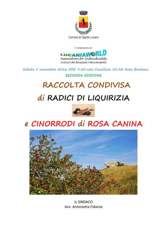 Raccolta condivisa di radici di liquirizia e cinorrodi di rosa canina – seconda edizione Sabato 5 novembre 2016 ore 9,30, sala Consiliare Oppido Lucano ore …