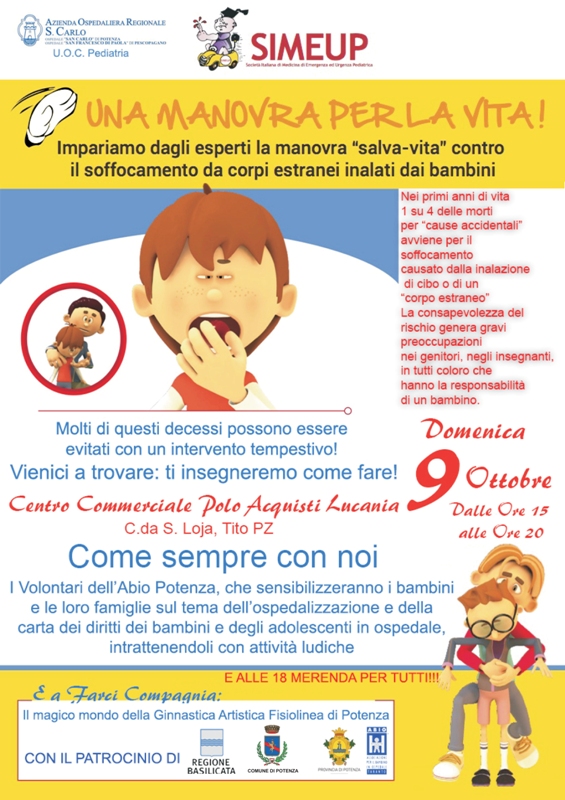 Impariamo dagli esperti la manovra “salva-vita” contro il soffocamento da corpi estranei inalati dai bambini Domenica 9 ottobre 2016, ore 15/20.00 Centro commerciale Polo Acquisti …