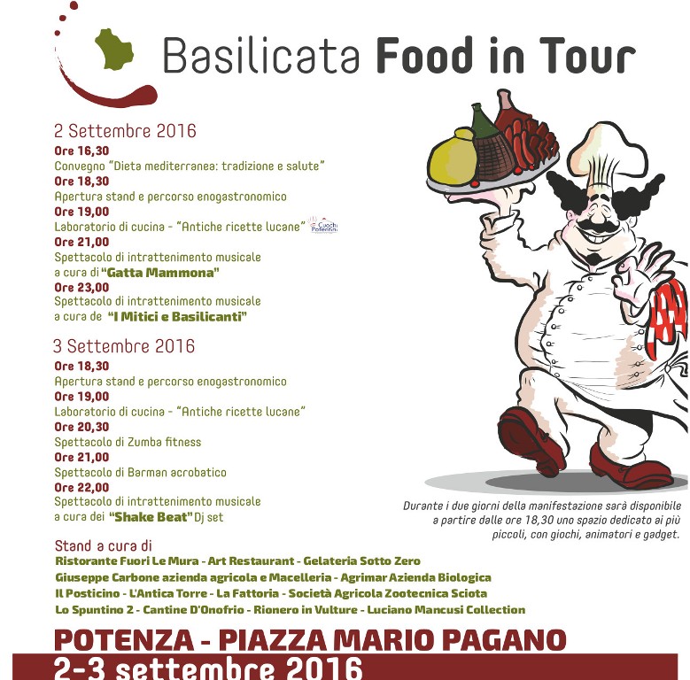 Convegno “Dieta mediterranea: tradizione e salute”, laboratori di cucina, stand e intrattenimento musicale 2 e 3 settembre 2016 Piazza Mario Pagano – Potenza Programma