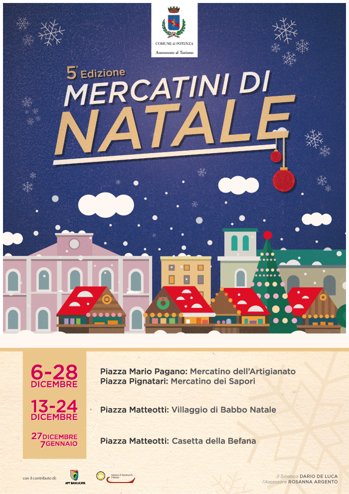 Oltre ai tradizionali stand dedicati all’Artigianato, da domenica 14 dicembre i “Mercatini di Natale” di piazza Mario Pagano si arricchiranno di ulteriori stand che ospiteranno il “Mercatino dei Sapori”. Verranno proposti i prodotti enogastronomici di eccellenza della Basilicata con certificazione DOC, DOP e IGP, oltre al miele ed i suoi derivati quali propoli, pappa reale, ecc. Novità assoluta sarà la commercializzazione e degustazione gratuita di tartufo bianco e nero, nonché di prodotti di alta pasticceria artigianale premiati a Rimini nella rassegna nazionale di settore.