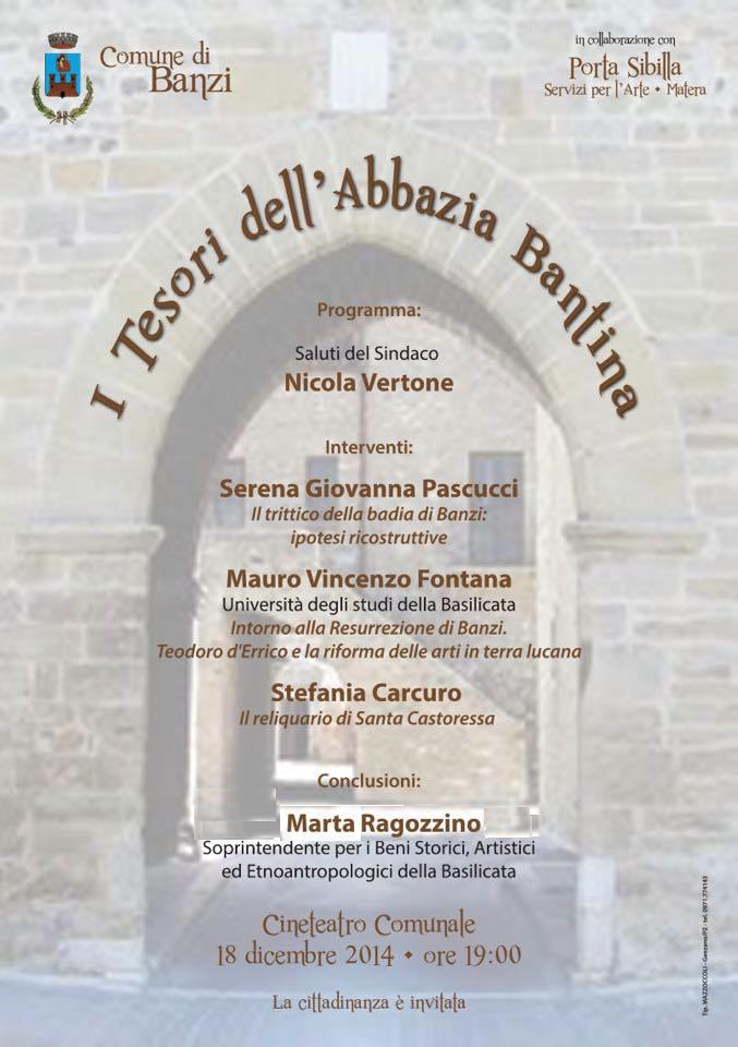 17 Dicembre 2014 Giornata di studio I TESORI DELL’ABBAZIA BANTINA Cineteatro comunale, Banzi (PZ) 18 dicembre 2014, ore 19.00 banzi_locandina.pngcomunicato stampa tesori abbazia.pdf