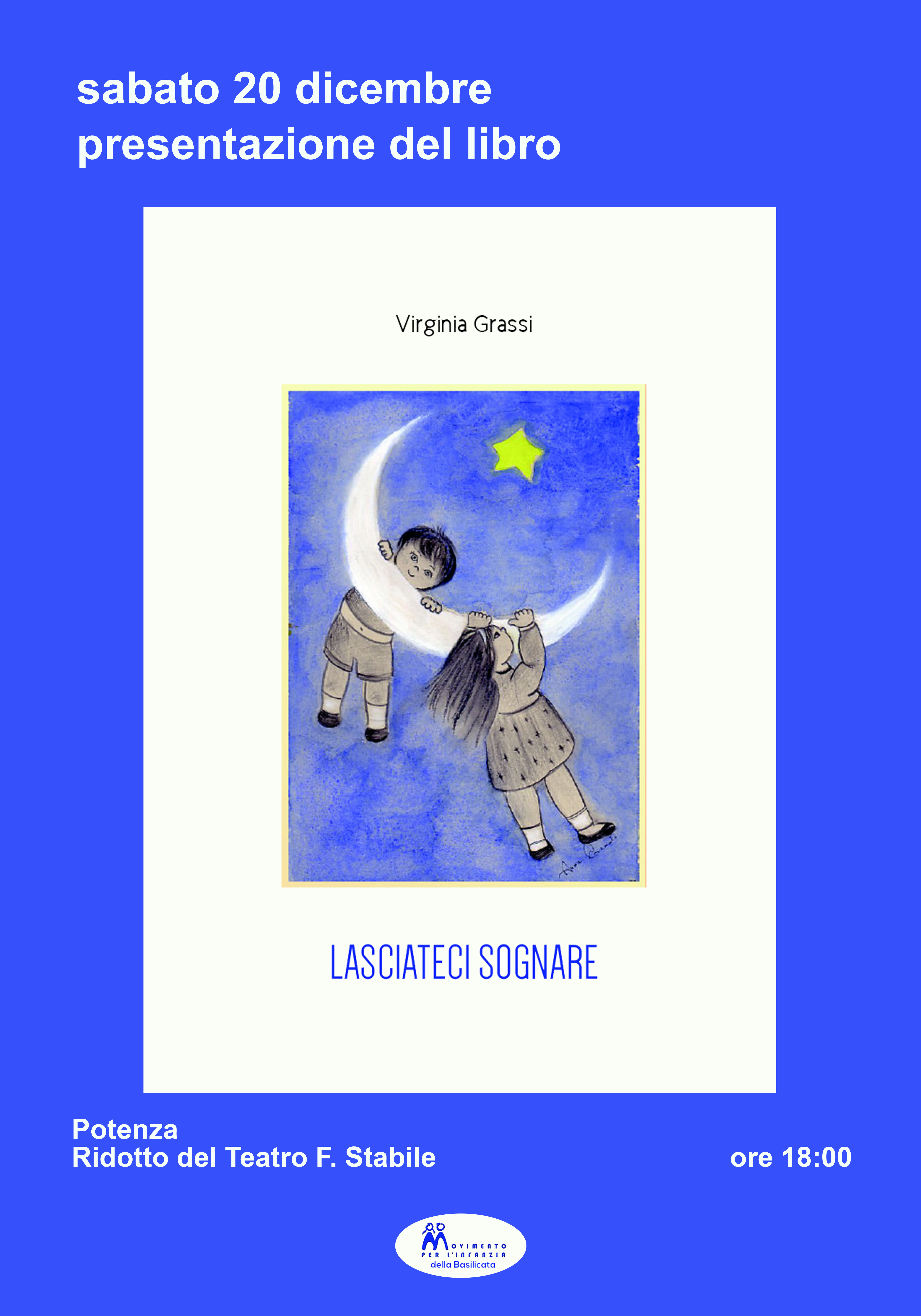 L’associazione Movimento per l’Infanzia di Basilicata, da anni impegnata su tutto il territorio regionale a svolgere iniziative, volte all’educazione preventiva di fenomeni che ledono i diritti dei più piccoli, ma anche alla tutela e alla prevenzione di fatti contro la violenza sui piccoli, ha editato questo piccolo volume “Lasciateci sognare” al solo costo di Euro 5,00. Si tratta in realtà di una iniziativa inserita nell’ambito delle manifestazioni di Natale organizzate dal Comune di Potenza. Il ricavato sarà utilizzato per portare gioia, sorrisi e doni ai ragazzi di una casa famiglia scelta dal Direttivo dell’Associazione stessa.
