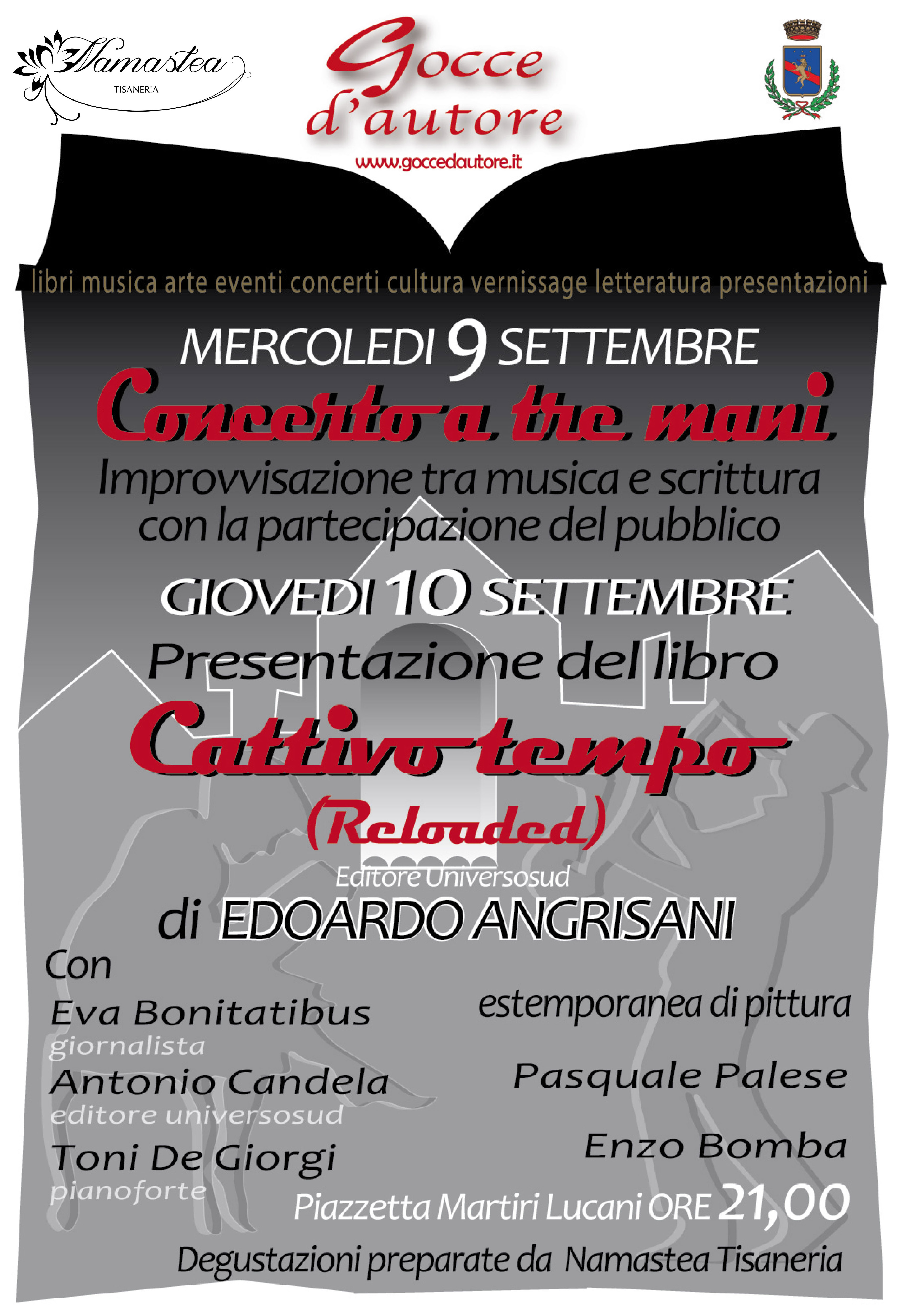 10 Settembre 2015 Appuntamenti Gocce d’autore Gocce d’autore Due appuntamenti con la musica, i libri e l’arte 9 e 10 Settembre alle 21,00 nella Piazzetta Martiri lucani Cs serate Gocce.pdflocandinba namastea (1).jpg