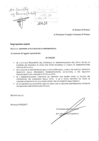 2 Marzo 2017 Interrogazione di Carretta Gestione A.C.T.A. e raccolta differenziata Testo dell’interrogazione