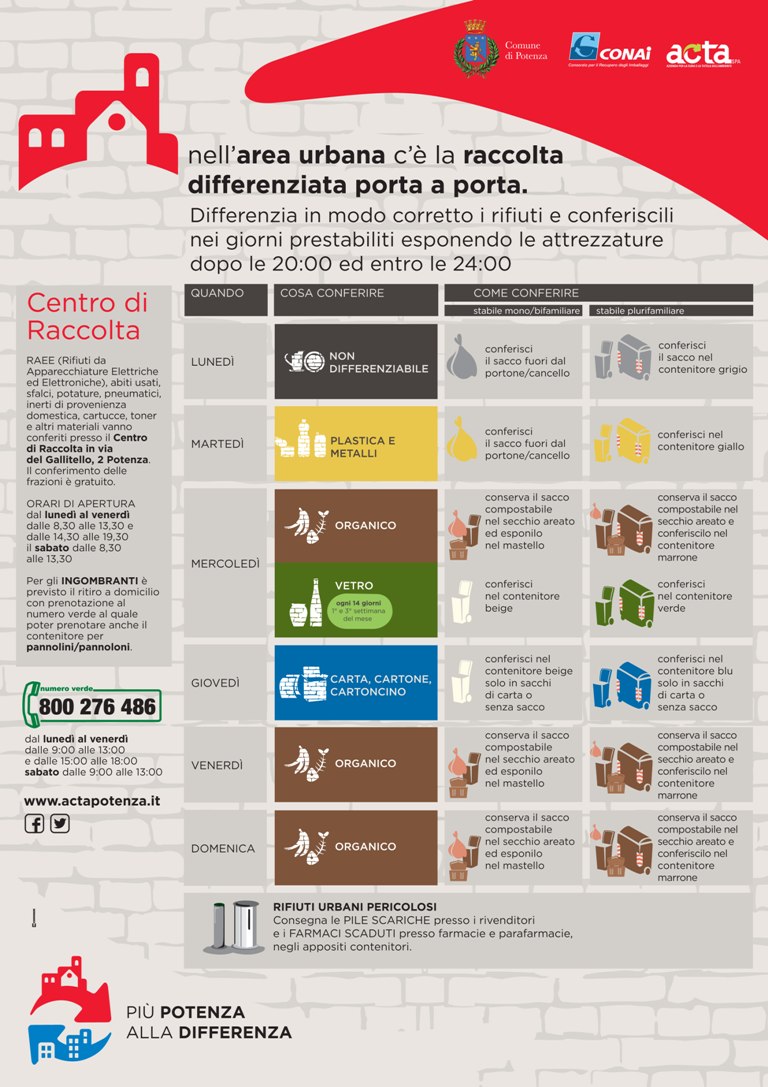 Il servizio di Raccolta differenziata prevede modalità di conferimento dei rifiuti differenti in base alla zona.