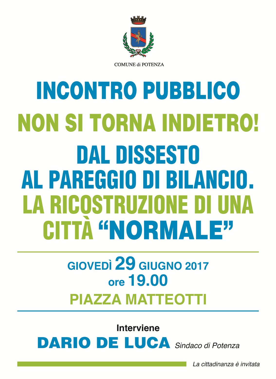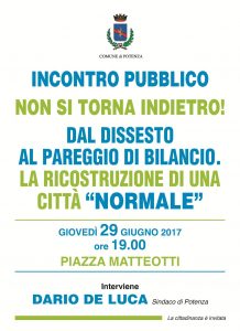 28.06.17-ore 13,05: “Non si torna indietro! Dal dissesto al pareggio di bilancio – La ricostruzione di una città ‘Normale’.”, questo il titolo dell’incontro pubblico in programma giovedì 29 giugno alle ore 19 in piazza Matteotti. Il Sindaco e i componenti della Giunta spiegheranno quanto realizzato nel corso dei tre anni di governo cittadino e le azioni in programma nel prossimo futuro. “Abbiamo ritenuto di presentare pubblicamente quanto fatto, ringraziando la cittadinanza per la pazienza e i sacrifici che sono stati compiuti, illustrando il presente e il futuro della nostra Città e, quindi, della nostra Comunità” ha spiegato il Sindaco.