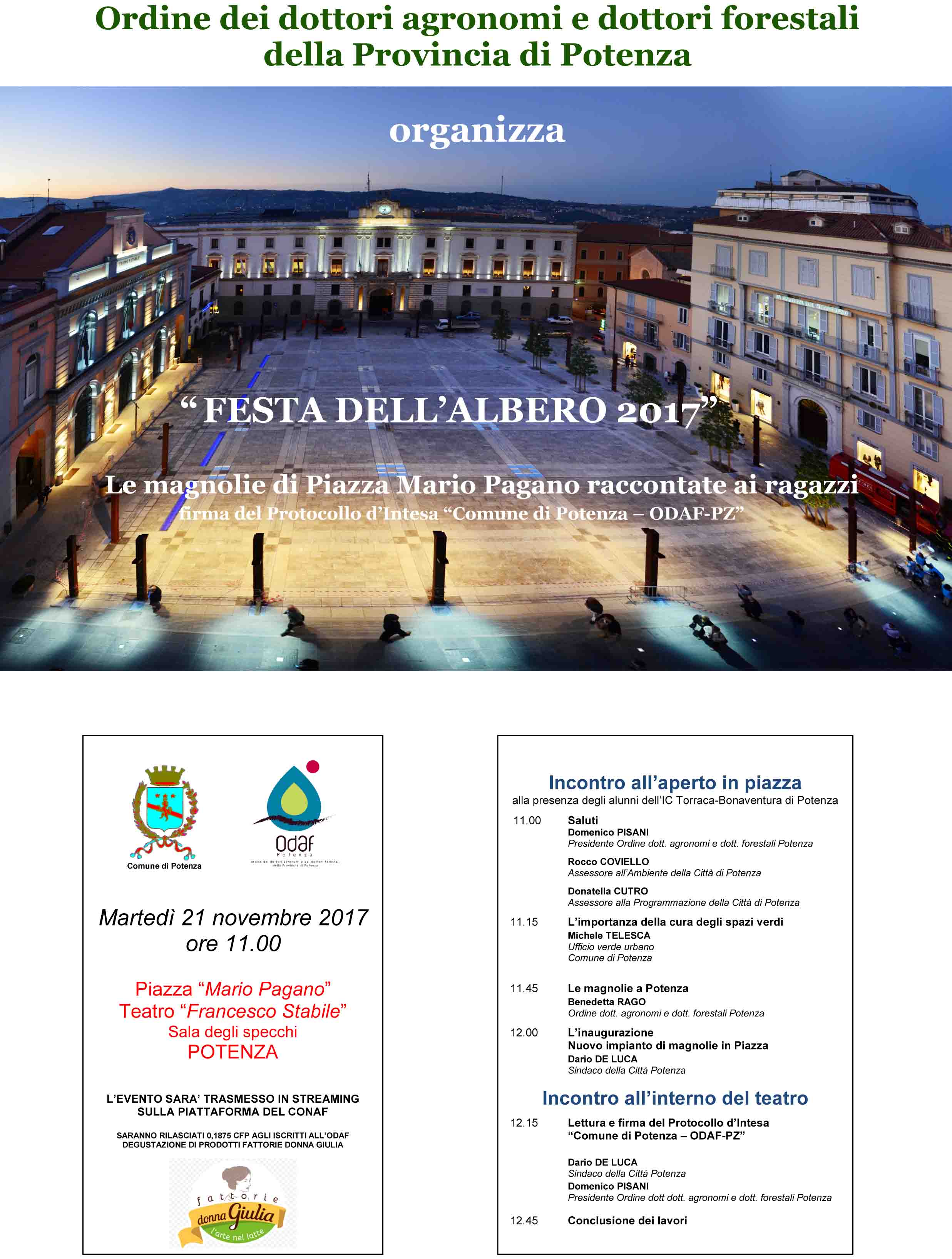 Durante questa giornata, dopo la parte didattica, all’interno della sala degli specchi del Teatro Stabile sarà siglato il Protocollo d’Intesa tra Comune di Potenza e Ordine degli Agronomi teso alla collaborazione tra i due enti pubblici che prevede – tra le altre cose – la redazione del censimento del verde della città attraverso la rilevazione e l’analisi di dettaglio sulle caratteristiche del verde privato e pubblico delle aree urbane e peri-urbane e l’istituzione lo Sportello Unico del Verde Urbano (SUVU) (ad integrazione del Portale Cartografico Comunale, del Portale del Verde Urbano, dello Sportello Unico per le Attività Produttive (SUAP) e dello Sportello Unico digitale per l’Edilizia (SUdE)), creato per rafforzare il percorso di digitalizzazione e dematerializzazione degli strumenti di pianificazione e per offrire al decisore tutti gli elementi per il migliore modello di gestione del territorio.