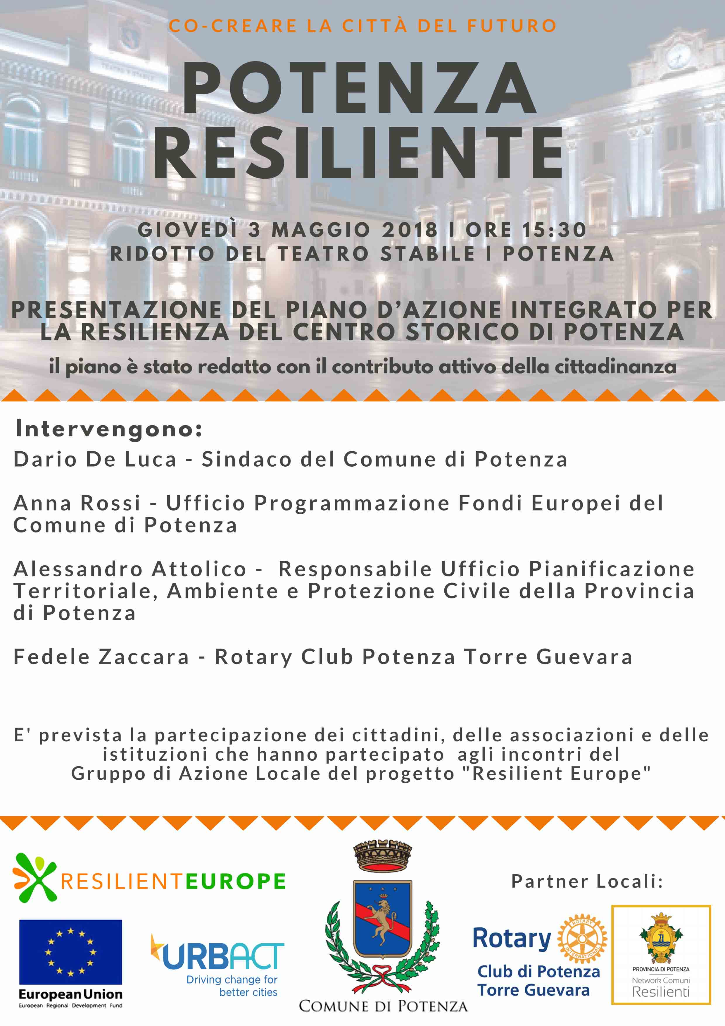 2.5.18-ore 13,35: Si terrà alle 15,30 di giovedì 3 maggio, nel Ridotto del teatro Stabile, la presentazione del ‘Piano d’azione integrato per la resilienza del Centro storico di Potenza’ redatto con il contributo attivo della cittadinanza. L’appuntamento conclude il progetto Resilient Europe, condotto dalla Città di Potenza in partenariato con altre 10 città europee.