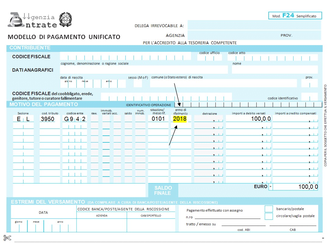 Ai fini del pagamento degli avvisi, sarà pertanto necessario aggiungere a penna sul modello F24 l’indicazione 2018 in corrispondenza della voce anno di riferimento, come evidenziato nell’immagine che segue.