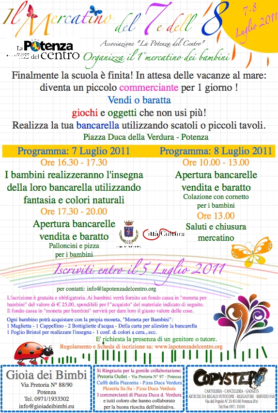 23 Giugno 2011 Il mercatino del 7 e dell’8 luglio 2011 -Ass. “La Potenza del Centro” Potenza, 7 – 8 luglio 2011 L’Associazione “La Potenza del Centro”, organizza il I° mercatino dei bambini Info: info@lapotenzadelcentro.org locandina_sito.jpg