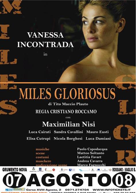 Miles Gloriosus (Il soldato spaccone) scritta da Plauto tra la fine del III e l’inizio del II secolo a.C., narra le vicende del soldato Pirgopolinice, noto per le sue spropositate e infondate vanterie. Ma il soldato verrà punito dal solito servo furbo che, alleato con altri personaggi, permetterà alla ragazza, rapita dal soldato, di ricongiungersi con il suo padrone. È la commedia più lunga di Plauto, che per ottenere l’applauso della platea assecondava il pubblico addobbando le sue commedie di sorprese e battute comiche, di equivoci e scambi di persona, di beffe e raggiri, di giochi di parole e doppi sensi (anche triviali). Plauto è il padre del teatro comico popolare moderno: nelle sue commedie non esistono né moralità, né umanità: i rapporti tra gli uomini si basano sull’inganno, la frode o il tornaconto personale. In questa messinscena semplice, che si avvale anche della straordinaria bellezza e della simpatia travolgente di Vanessa Incontrada, con attori bravissimi che dialogano tra loro e con il pubblico, l’intreccio – spietato nello svelare gli istinti che muovono i personaggi – ci restituisce un’immagine disincantata e divertente delle vicende umane, che rimangono immutate nel tempo. Sempre le stesse, 2000 anni fa come oggi.”Ecco perché Plauto è per me un contemporaneo, così come tutta quell’arte che appartiene alla tradizione della Commedia all’italiana” (dalle noti di regia di Cristiano Roccamo).