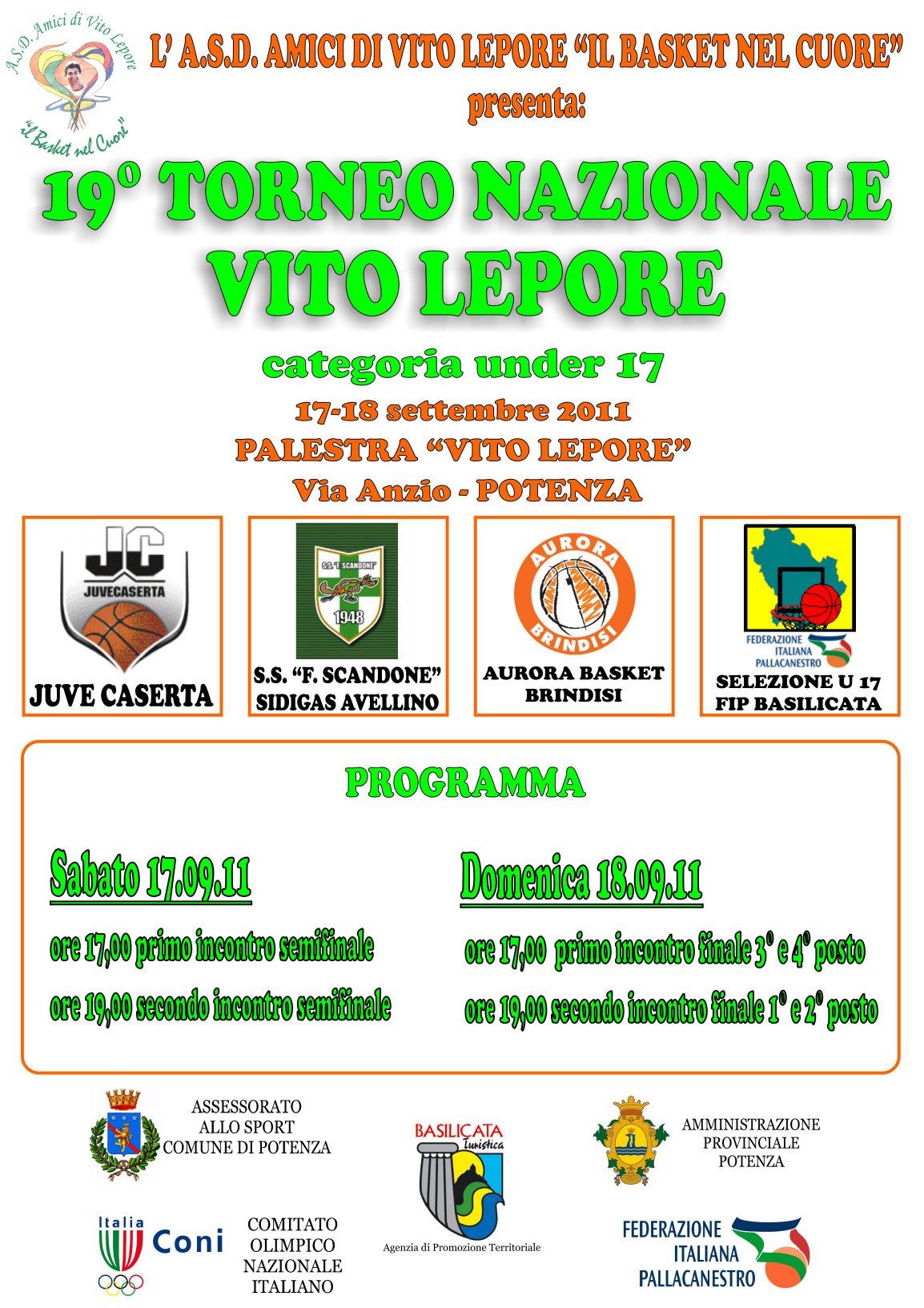 18 Settembre 2011 19° torneo nazionale Vito Lepore, 17/18 settembre 2011 19° torneo nazionale Vito Lepore Categoria under 17 17 e 18 settembre 2011 Palestra “Vito lepore”, Via Anzio – Potenza LOCANDINA_2011.jpg