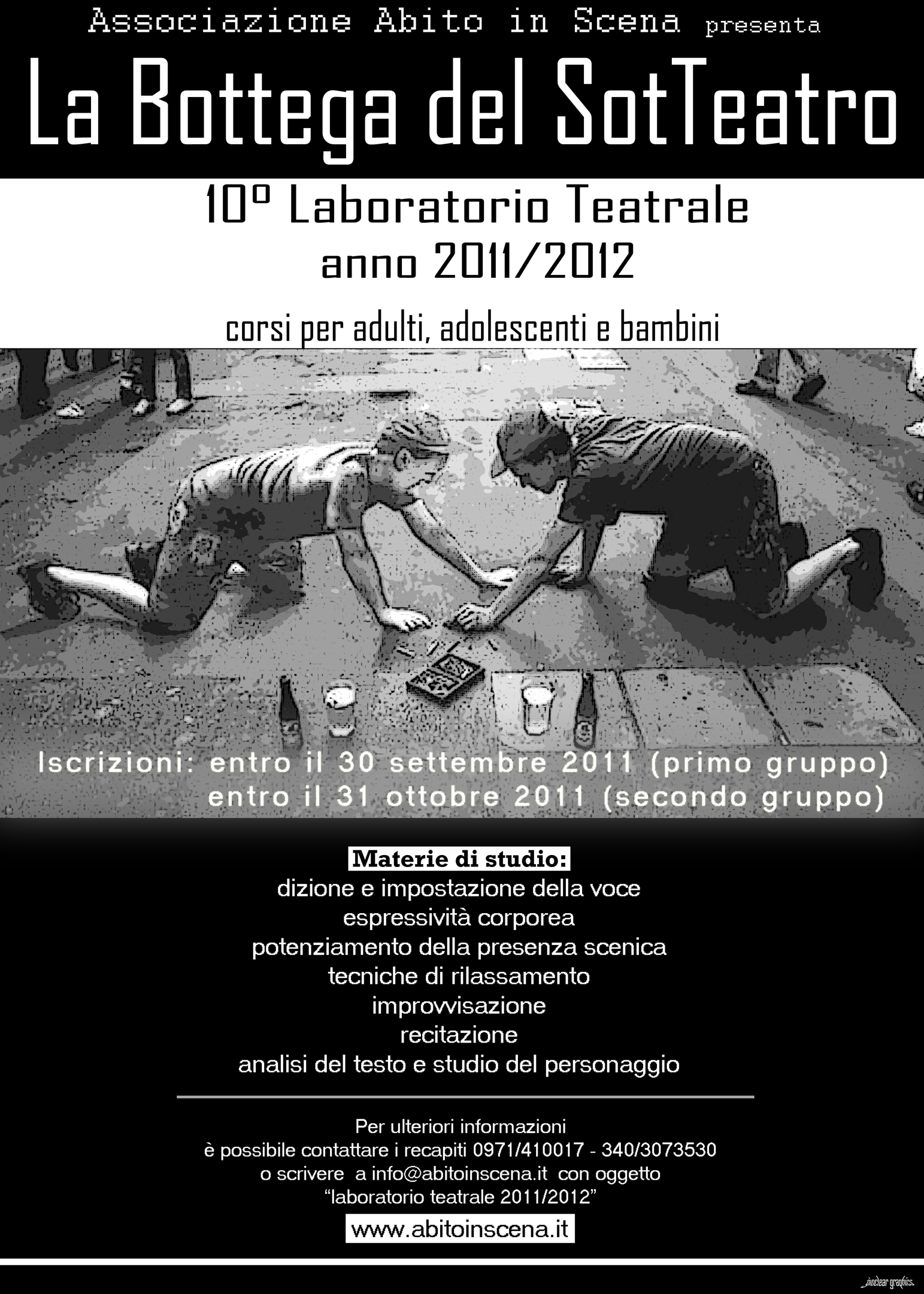 E’ possibile iscriversi entro il 30 settembre 2011 per i laboratori che inizieranno ad ottobre oppure entro il 31 ottobre 2011 per i corsi che inizieranno a novembre 2011. Per info: SotTeatro, vico Laura Battista, centro storico, Potenza info@abitoinscena.it – 340.3073530 – 0971.410017