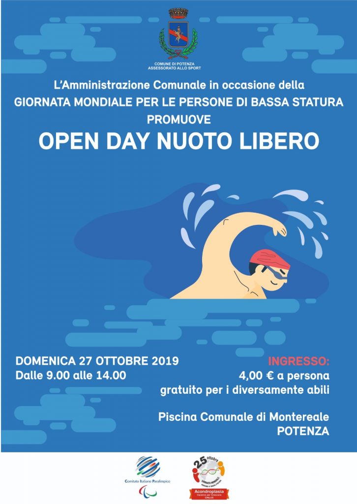 25.10.2019 – ore 10,55: “L’Amministrazione comunale, in occasione della Giornata mondiale per le persone di bassa statura ha previsto l’apertura della piscina ‘Michele Riviello’, all’interno del complesso sportivo di parco Montereale, la mattina di domenica 27 ottobre 2019, dalle ore 9 alle ore 14”. A comunicarlo l’assessore allo Sport Patrizia Guma che sarà presente nell’impianto natatorio “per incontrare i cittadini e confrontarsi sulle esigenze che i frequentatori della piscina vorranno presentarmi. E’ nostra intenzione – prosegue la Guma – raccogliere le diverse proposte per rendere, questo che è uno dei luoghi storici dello sport del capoluogo, sempre più fruibile a coloro che lo utilizzano e quanti vorranno cominciare a farlo. La pratica sportiva – conclude l’assessore – oltre a contribuire in maniera fondamentale al benessere di ciascuno di noi, è anche occasione di socializzazione e, all’inizio di questo percorso che ci porterà a essere nel 2021 ‘Città europea dello Sport’, può e deve offrire a tutti noi la possibilità di prepararci nel migliore dei modi a un appuntamento importante per la nostra comunità e per quelle che vivono nei comuni lucani”. Il costo per l’ingresso alla vasca sarà di 4 euro, mentre sarà gratuito per le persone con disabilità.