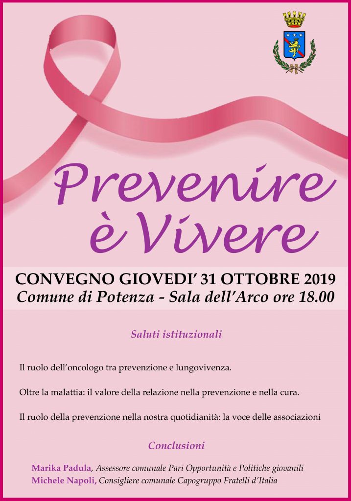 29.10.19 – ore 13,10: Ottobre è ribattezzato il ‘mese rosa’, dedicato a una serie di campagne e iniziative per la prevenzione del tumore al seno. Anche il Comune di Potenza, su proposta del gruppo Fratelli d’Italia, di concerto con il Sindaco e i gruppi della maggioranza, ha deciso di aderire alla campagna “Illuminiamo la prevenzione”, simbolo universale per la salute del seno, che ha come obiettivo quello di sensibilizzare un numero sempre più ampio di donne sull’importanza vitale della prevenzione e della diagnosi precoce dei tumori della mammella, informando il pubblico femminile anche sulle abitudini di vita correttamente sane da adottare e sui controlli diagnostici da effettuare. Per aderire all’iniziativa nazionale sarà illuminato di rosa il Palazzo di Città sede municipale di piazza Matteotti. A seguire, giovedì 31 ottobre, alle ore 18 nella Sala dell’Arco dello stesso Palazzo, si terrà un convegno di sensibilizzazione alla prevenzione del tumore al seno. Interverranno i rappresentanti delle Istituzioni, i professionisti del settore, le associazioni impegnate nella lotta contro la forma di tumore più frequente nella popolazione femminile.