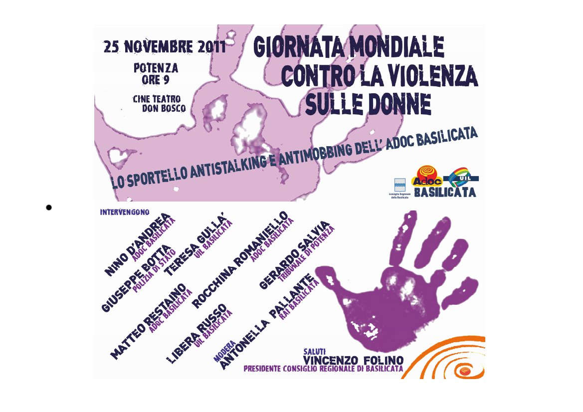 17 Novembre 2011 Giornata mondiale contro la violenza sulle donne – 25 novembre 2011 Convegno: “Giornata Mondiale contro la violenza sulle donne“ 25 novembre 2011 – ore 9.00 Potenza,Teatro Don Bosco invito.jpg