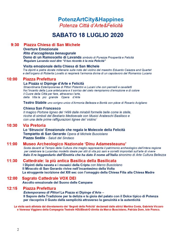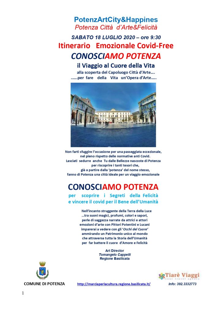 “Con il primo itinerario Emozionale Covid-Free alla scoperta di ‘Potenza Città d’Arte&Felicità’ ‘PotenzArtCity&Happiness’ che si terrà sabato 18 luglio diventa realtà la proposta di rilancio turistico del capoluogo di regione presentata nel Palazzo della Cultura e del Turismo il 23 giugno scorso nella conferenza stampa ‘Scopri Potenza Città d’Arte’ a cui hanno partecipato enti, istituzioni, APT, MIBACT, operatori di settore e, tra le agenzie di viaggio, Tiarè Viaggi, che si è accollata l’onere dell’organizzazione dell’evento/lancio”.