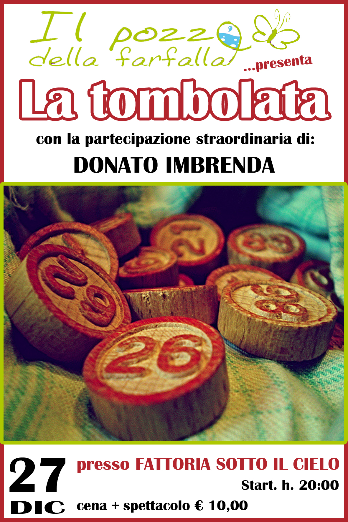 16 Dicembre 2011 Il pozzo della farfalla Tombolta con la partecipazione di Donato Imbrenda 27 dicembre 2011, ore 20.00 Fattoria sotto il cielo