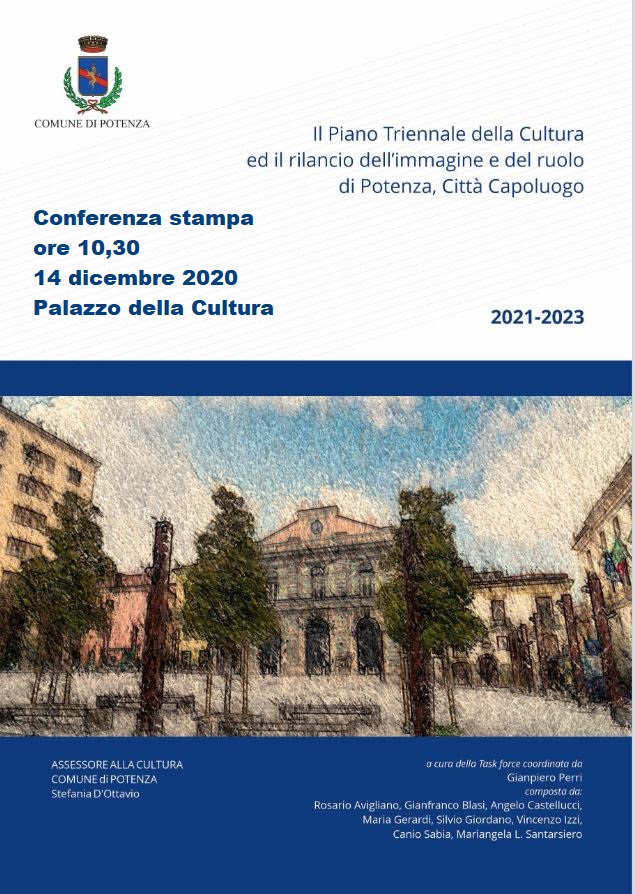11.12.2020 – ore 12: Il ‘Piano triennale della Cultura, il rilancio dell’immagine e il ruolo di Potenza, Città Capoluogo’ sarà presentato nel corso di una conferenza stampa in programma lunedì 14 dicembre alle ore 10,30, nella sala Conferenze del Palazzo della Cultura, in largo Pignatari. L’assessore alla Cultura, Stefania D’Ottavio, coadiuvata dalla task force coordinata da Gianpiero Perri, illustrerà ai giornalisti “l’iniziativa cardine per questa Amministrazione in ambito culturale. Si tratta – ha spiegato la D’Ottavio – di un lavoro nel quale crediamo fortemente e che abbiamo voluto per realizzare un’autentica rivoluzione per la nostra Città: un programma organico che, a cominciare dai prossimi tre anni, mira a rendere Potenza una città che nella Cultura ponga le basi per una nuova crescita sociale e identitaria. Il nostro grazie a Giampiero Perri e a tutta la task force per averci supportato in questo lavoro, stilando un documento completo e approfondito, che è stato capace di dare forma a un’idea programmatica che, siamo certi, non tarderà a produrre i benefici auspicati e raggiungere gli obiettivi che ci siamo prefissati”. All’incontro sarà presente il Sindaco di Potenza Mario Guarente e, oltre all’assessore D’Ottavio e a Perri, i componenti della task force Rosario Avigliano, Gianfranco Blasi, Angelo Castellucci, Maria Gerardi, Silvio Giordano, Vincenzo Izzi, Canio Sabia, Mariangela L. Santarsiero.