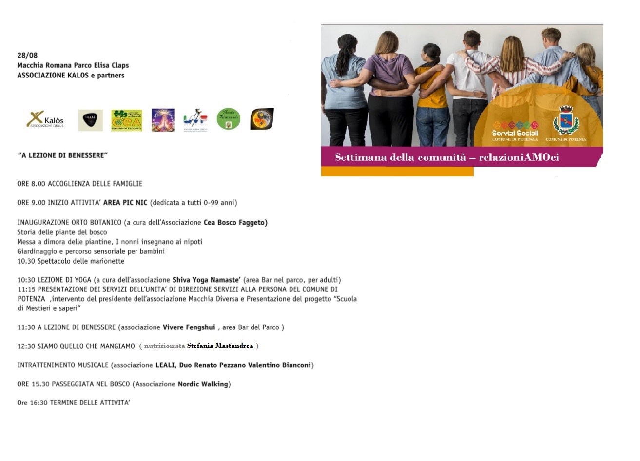 26.08.2021 – ore 13,40: Sabato 28 Agosto 2021, il Parco ‘Elisa Claps’ a Macchia Romana farà da cornice alla quarta tappa di ‘La settimana della comunità – relazioniAMOci’, il progetto dell’assessorato alle Politiche sociali del Comune di Potenza, organizzato dai Servizi sociali.