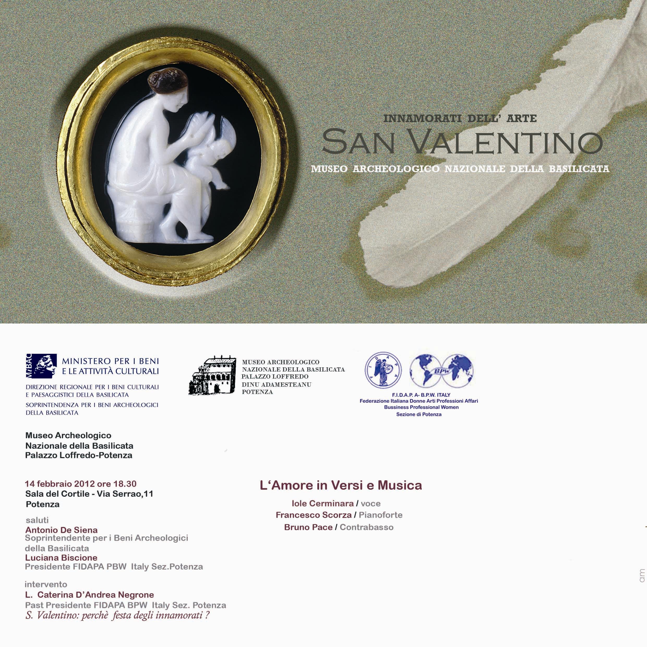 Viaggio emozionale attraverso le più belle canzoni d’amore della grande tradizione cantautorale italiana e internazionale. I brani saranno accompagnati dalla lettura di versi d’amore scritti dalle più celebri firme della poesia. L’iniziativa rientra nelle manifestazioni promosse dal Ministero per i Beni Culturali per la Festa di San Valentino ed è organizzata dalla Soprintendenza per i Beni Archeologici della Basilicata in collaborazione con la Sezione di Potenza dell’Associazione F.I.D.A.P.A.-B.P.W. Italy (Federazione Italiana Donne Arti Professioni Affari Business Professional Women).