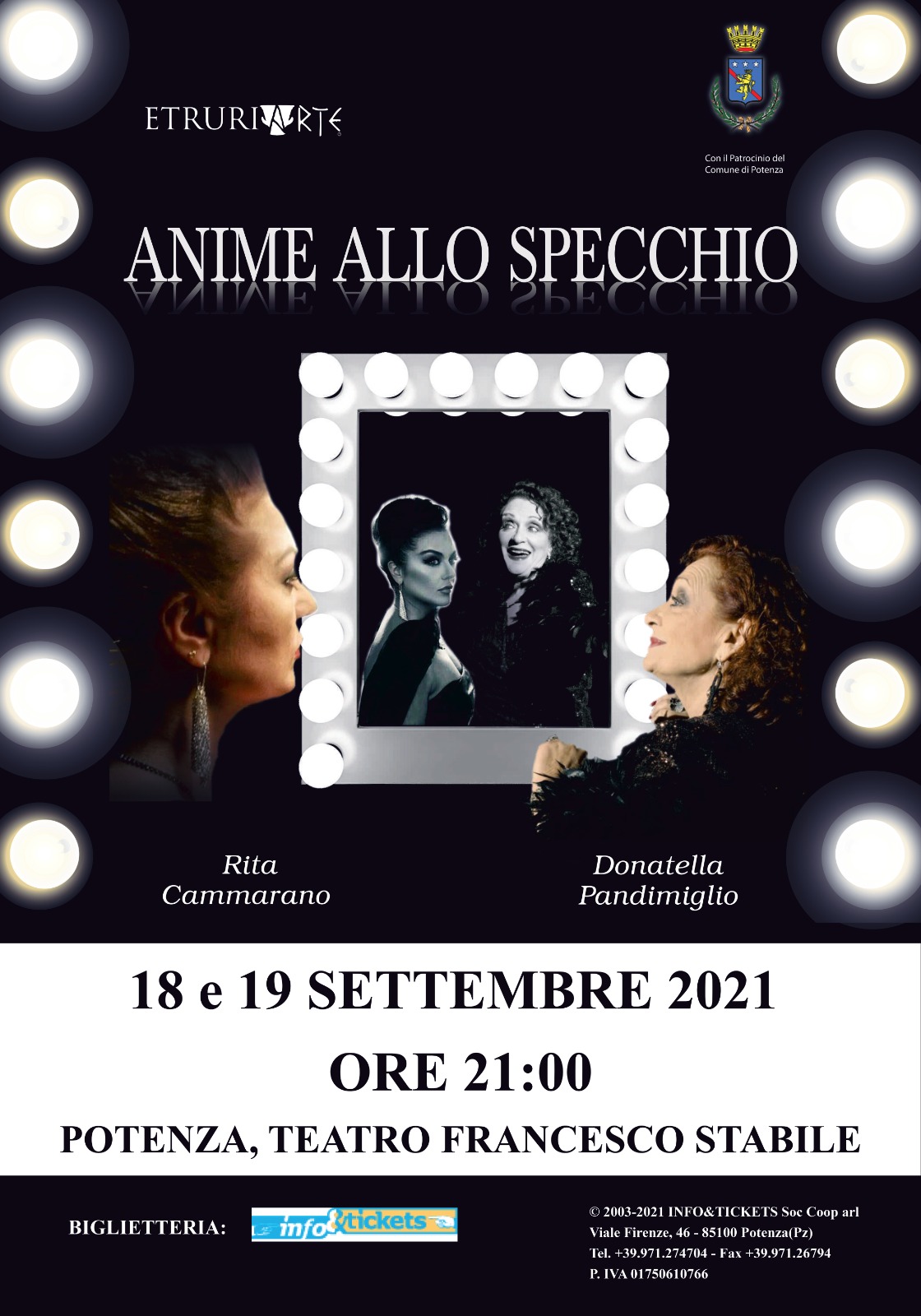 16.09.2021 – ore 10: E’ in programma sabato 18 e domenica 19 settembre 2021, al teatro Stabile, in piazza Mario Pagano a Potenza, sipario ore 21, la prima dello spettacolo ‘Anime allo specchio’ con Donatella Pandimiglio, Rita Cammarano e l’Ensemble della Compagnia nazionale del Balletto. Coreografie di Giacomo Molinari, solista Carmen Sabia, corpo di ballo Simona del Nigro, Luigi Greco, Mirko Luigi Giannini, Marika La Bianca, Anita Pepe e Vittoria Tagliapietra, light designer Alessandro Molinari. “Un’opportunità di rilievo per Potenza e i potentini: sulla scena apprezzeremo un evento di livello nazionale: due artiste come Rita Cammarano e Donatella Pandimiglio, presenteranno uno spettacolo di grande qualità, per la prima volta in Italia, e l’aver scelto la nostra città, non può che incontrare il nostro favore, avendo scelto, come Amministrazione e come assessorato alla Cultura, proprio la linea della qualità per tutto quello che concerne gli eventi culturali”, così l’assessore Stefania D’Ottavio. Si tratta di due nomi molto noti sui palcoscenici nazionali, con impostazioni artistiche molto diverse tra loro, legate però dalla collaborazione di entrambe in spettacoli importanti col maestro Nicola Piovani (Premio Oscar per ‘La vita è bella’) (per la Cammarano ricordiamo ‘La pietà’ mentre per la Pandimiglio tra i tanti ricordiamo ‘Canti di scena’). Carismatiche, dotate di talento, si metteranno in gioco attraverso i loro personali repertori (che spazieranno dalla Lirica al Musical fino alla Canzone Popolare) protese e spinte da un desiderio artistico unico: il desiderio di incontro, di fusione, di scambio. “Lo spettacolo – spiegano le due protagoniste – che unisce musica teatro e danza in un’ unica cornice magica di grande livello artistico, rispecchia sì quello che le due artiste sono, ma ciascuna pur felice di ciò che è, scopre di essere stata sempre anche un poco l’altra, forse senza saperlo, come se ognuna fosse anche parte dell’anima dell’altra (Anime allo specchio) e questo ci diverte e ci stimola; giocheremo a miscelarci, uscendo ed entrando dai vari stili con curiosità, mai con competizione. Quindi le nostre voci arriveranno anche a fondersi, intrecciarsi, passando attraverso momenti ironici che raccontino tutto questo”. Gli spettatori potranno ritrovarsi incantati e rapiti dalla magia vocale e dalle versatilità sorprendenti di queste artiste che col loro fascino, la loro classe scenica e la loro autoironia li ricondurranno in un’atmosfera tra il patinato mondo delle dive hollywoodiane e il mondo del pop/rock. Ad arricchire questo nuovo spettacolo evento ci sarà la presenza di videoproiezioni a cura di FIELS A1 Srls, di Valerio Antonio Ciminelli e Fabio Pasquali, con la preziosa supervisione di Massimiliano Siccardi, e soprattutto la presenza di danzatori dell’Ensemble della Compagnia Nazionale del Balletto che racconteranno insieme alle due artiste alcuni quadri, rendendoli così più intensi e spettacolari.
