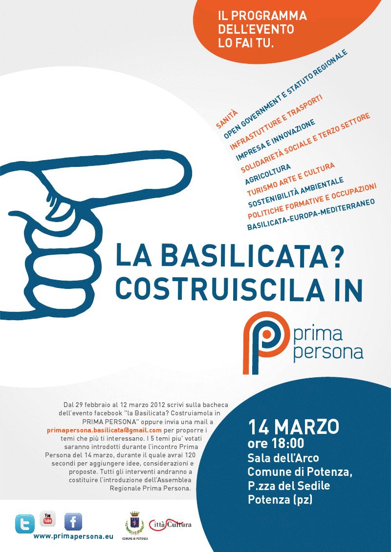 Dal 29 febbraio al 12 marzo 2012 scrivi sulla bacheca dell’evento facebook “la Basilicata? Costruiamola in PRIMA PERSONA” oppure invia una mail a primapersona.basilicata@gmail.com per proporre i temi che più ti interessano. I 5 temi più votati saranno introdotti durante l’incontro Prima Persona del 14 marzo, durante il quale avrai 120 secondi per aggiungere idee, considerazioni e proposte. Tutti gli interventi andranno a costituire l’introduzione dell’Assemblea Regionale Prima.