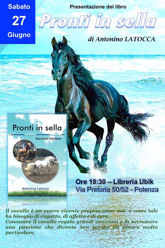 Sabato 27 giugno, ore 18:30: “Pronti in sella” di Antonino Latocca, un manuale completo sull’equitazione e sul mondo del cavallo, con approfondita analisi dei regolamenti FISE del Salto Ostacoli, moderano il Dott. Rocco Di Santo e Antonella Ambrosio