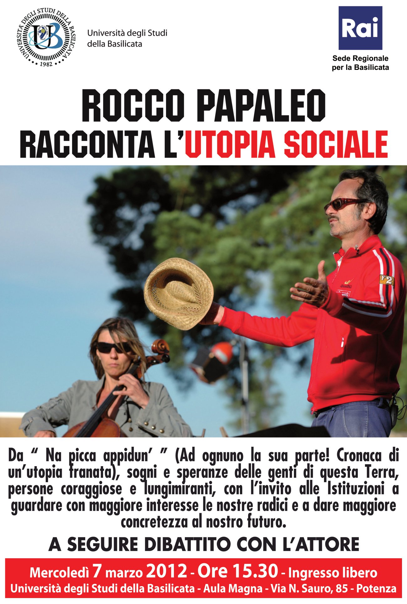 Rocco Papaleo racconta l’utopia sociale, tema legato indissolubilmente alle genti e alla memoria del territorio lucano. I sogni e le speranze di persone coraggiose e lungimiranti non possono essere disattese dalle Istituzioni che devono guardare con maggiore interesse le radici e dare maggiore concretezza al futuro di questa terra.
