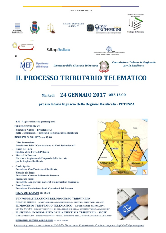 24 Gennaio 2017 Seminario Il processo tributario telematico 24 gennaio 2017, ore 15.00 Sala Inguscio, Regione Basilicata, via Anzio – Potenza Locandina
