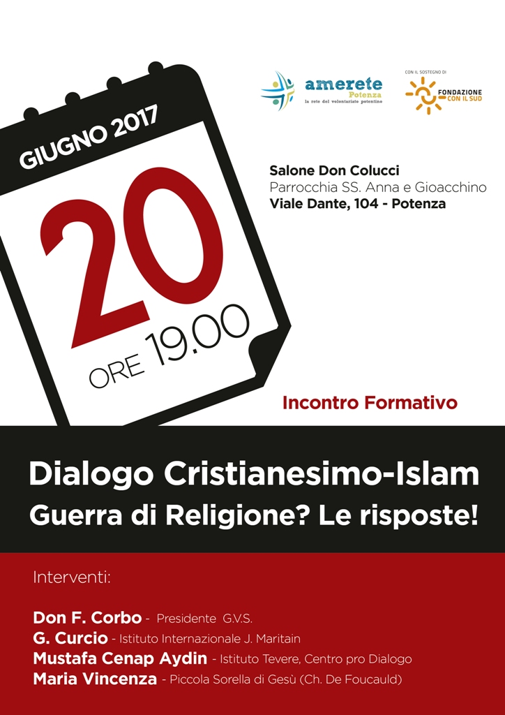 “Dialogo Cristianesimo. Guerra di religione? Le risposte!”, momento di confronto tra persone di fedi religiose differenti, coordinato da Vito Telesca, Presidente CILAP, che vedrà la partecipazione di Don Franco Corbo, parroco e studioso della materia, un Imam e una rappresentante delle Piccole Sorelle di Gesù appartenente alla Famiglia Spirituale Charles de Foucauld, in collaborazione della Fondazione Città per la Pace e della Fondazione Maritain.e iniziative della “Città della Partecipazione”