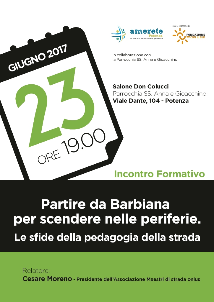 “Partire da Barbiana per scendere nelle periferie. Le sfide della pedagogia della strada” con Cesare Moreno, Presidente della onlus Maestri di Strada, che vede impegnati insegnanti ed educatori nella lotta alla dispersione scolastica. Con Cesare Moreno si affronterà il tema del far cultura come elemento straordinario di inclusione e di lotta a ogni forma di emarginazione, specie sul versante delle infanzie e dell’adolescenza, scambiando pratiche su come attivare processi partecipativi di strada.