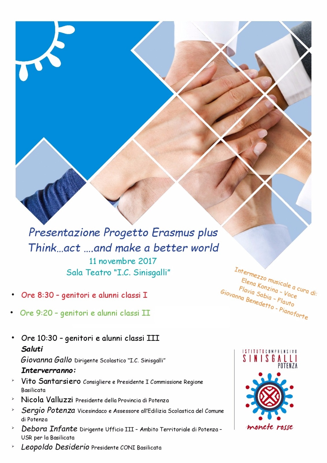 10 Novembre 2017 “Erasmus Plus `Think…act… and make a better world` Presentazione progetto Sabato 11 novembre 2017, ore 8.30 Sala Teatro I.C. Sinisgalli, via Anzio – Potenza Locandina