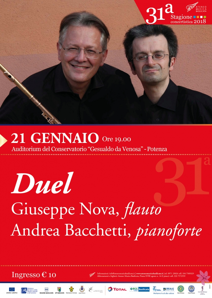 Continua la stagione di Ateneo Musica Basilicata in collaborazione con La Provincia di Potenza con un nuovo appuntamento per un concerto per flauto e pianoforte, con un duo d’eccezione domenica 21 gennaio alle ore 19:00 presso l’auditorium del Conservatorio ” G. da Venosa ” di Potenza. Giuseppe Nova è considerato uno dei più rappresentativi flautisti italiani, ha esordito negli anni Ottanta come solista nell’orchestra sinfonica della Rai, tenuto concerti e masterclass in Europa e Stati Uniti e si è esibito, inoltre, in celebri sale e festival come Suntory Hall di Tokyo, Parco della Musica di Roma, Conservatorio di Pechino, Castello Esterhàzy, Università di Kyoto, Umbria Jazz, Accademia di Imola, Teatro Rudolfinum di Praga, Teatro Filarmonico di Verona, America Latina e Asia. Andrea Bacchetti, noto al pubblico del piccolo schermo soprattutto per aver preso parte come pianista alla trasmissione “Chiambretti night” programma di Piero Chiambretti su Canale 5, è un musicista di grande talento.