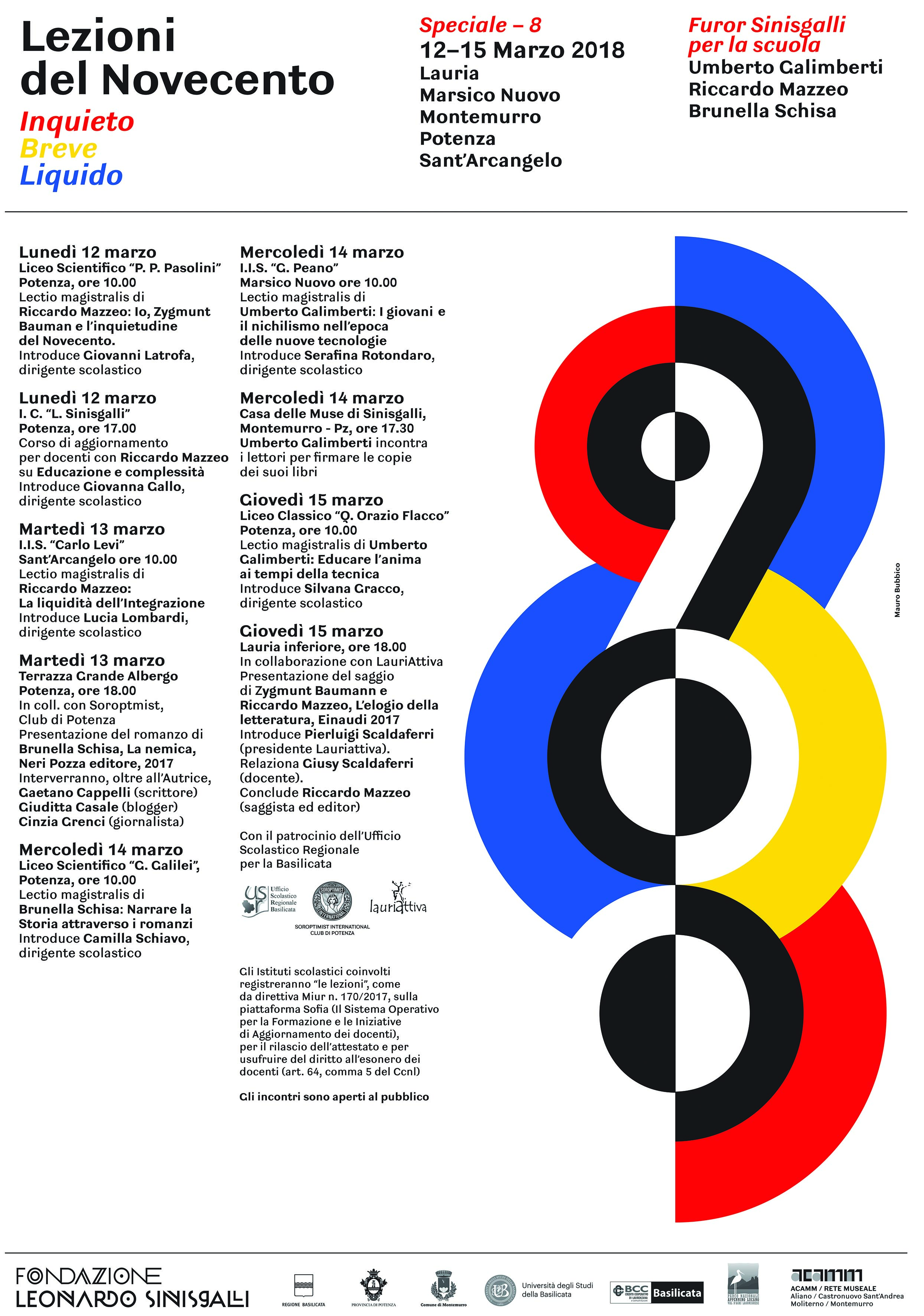 Tre grandi ospiti: il filosofo, psicologo, psicanalista, Umberto Galimberti, il saggista ed editor Riccardo Mazzeo, la scrittrice e giornalista Brunella Schisa. L’ottava edizione delle Lezioni, in programma fra il 12 e il 15 marzo, si svilupperà in 9 appuntamenti, con sei incontri scolastici rivolti in particolare a studenti e docenti, a Marsico Nuovo (IIS “G. Peano”), Potenza (Liceo Scientifico “P. P. Pasolini”, I.C. “L. Sinisgalli” di Potenza, Liceo Scientifico “G. Galilei”, Liceo Classico “Q. Orazio Flacco”), Sant’Arcangelo (I.I.S. “Carlo Levi”), e tre presentazioni di volumi a Montemurro, Lauria e Potenza.
