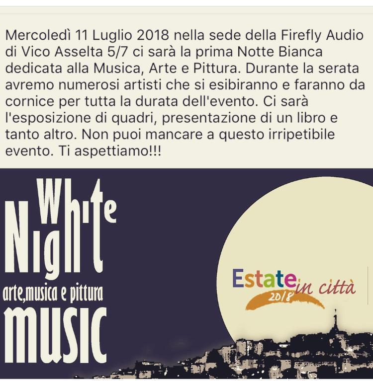 11 Luglio 2018 Notte bianca Arte, musica e pittura Mercoledì 11 luglio 2018 Sede Firefly audio, vico Asselta, 5/7 – Potenza Locandina