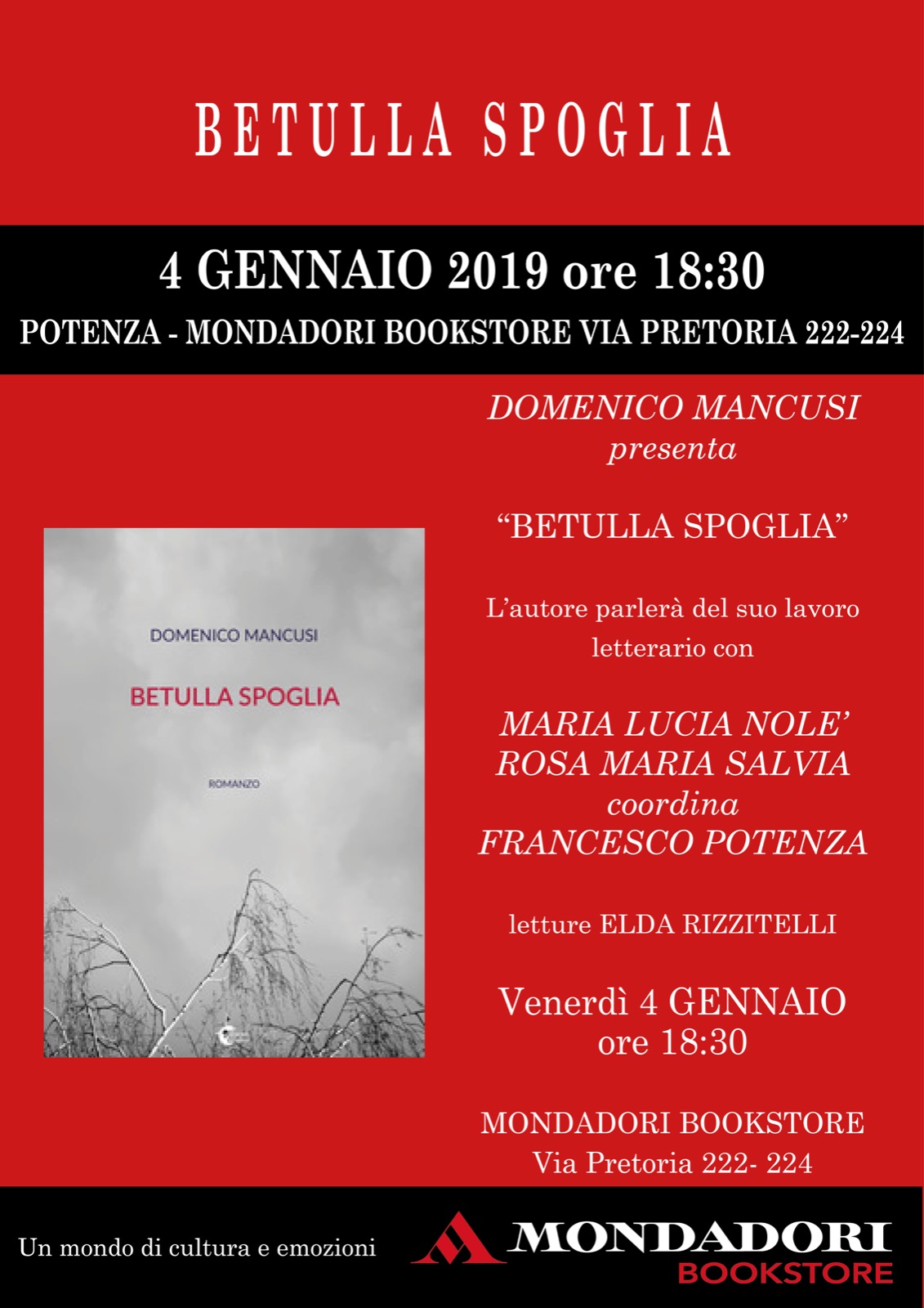 2 Gennaio 2019 Presentazione libro “Betulla spoglia” di Domenico MancusiVenerdì 4 gennaio 2019, ore 18.30Libreria Mondadori, via Pretoria – Potenza LocandinaScarica
