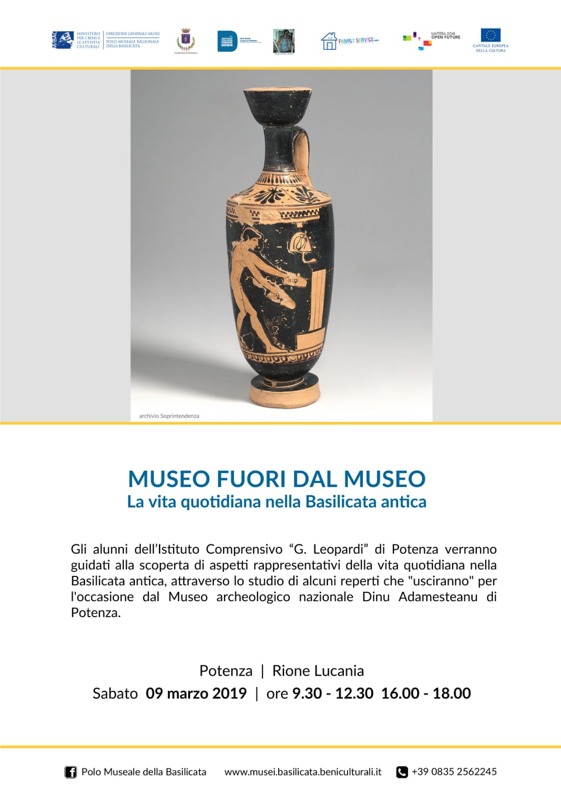 Gli alunni dell’I.C. “G. Leopardi” di Potenza verranno guidati alla scoperta di aspetti rappresentativi della vita quotidiana nella Basilicata antica, a ttraverso lo studio di alcuni reperti che usciranno per l’occasione dal museo Archeologico Nazionale Dinu Adamesteanu di Potenza.