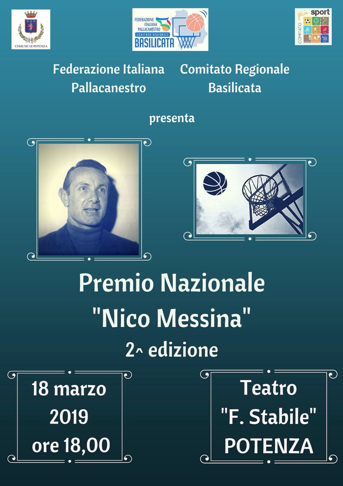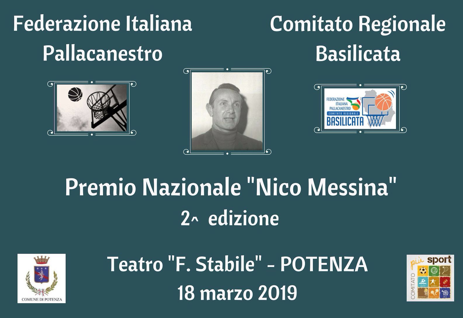 18 Marzo 2019 Federazione Italiana Pallacanestro Premio Nazionale “Nico Messina” II edizione18 marzo 2018, ore 18Teatro F. stabile, piazza M. Pagano – Potenza ManifestoScarica InvitoScarica