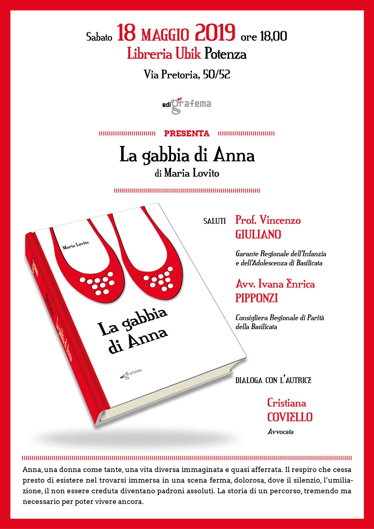 Con l’autrice dialogherà l’avvocata Cristiana Coviello; saluti dal Prof. Vincenzo Giuliano, Garante Regionale dell’Infanzia e Ivana Pipponzi, Consigliera Regionale di Parità della Basilicata.
