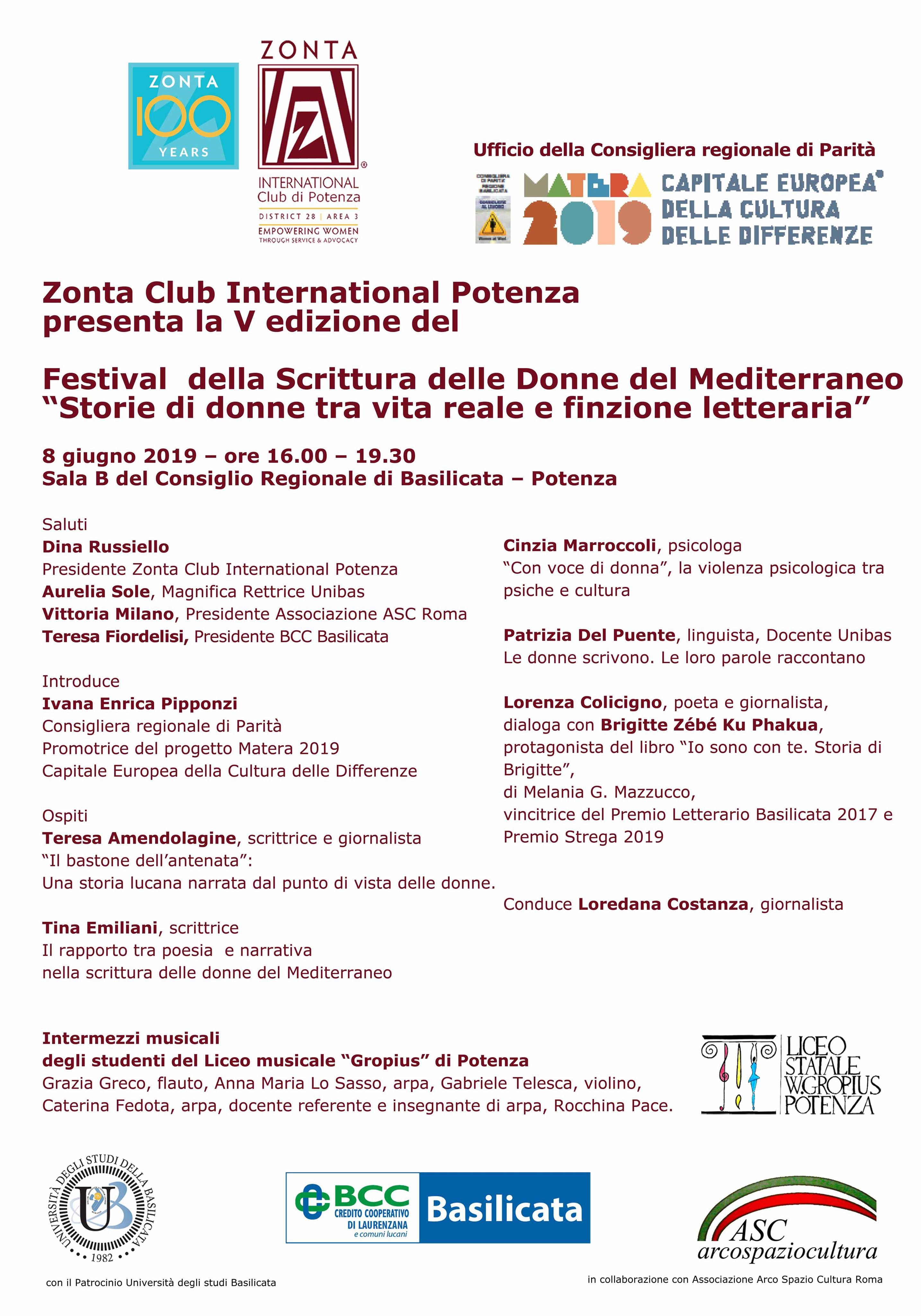 Sabato 8 giugno, dalle ore 16:00 alle ore 19:30, nella “Sala B del Consiglio Regionale di Basilicata” si terrà il Festival della Scrittura delle Donne del Mediterraneo “Storie di donne tra vita reale e finzione letteraria. Evento organizzato dallo ZONTA CLUB POTENZA, con i seguenti ospiti: Teresa Amendolagine, scrittrice e gionalista con il suo libro “Il bastone dell’antenata”; a seguire la scrittrice Tina Emiliani con “Il rapporto tra poesia e narrativa” ed, infine, Brigitte Zebè Ku Phakua, protagonista del libro di Melania Mazzucco “Io sono con te. Storia di Brigitte”.