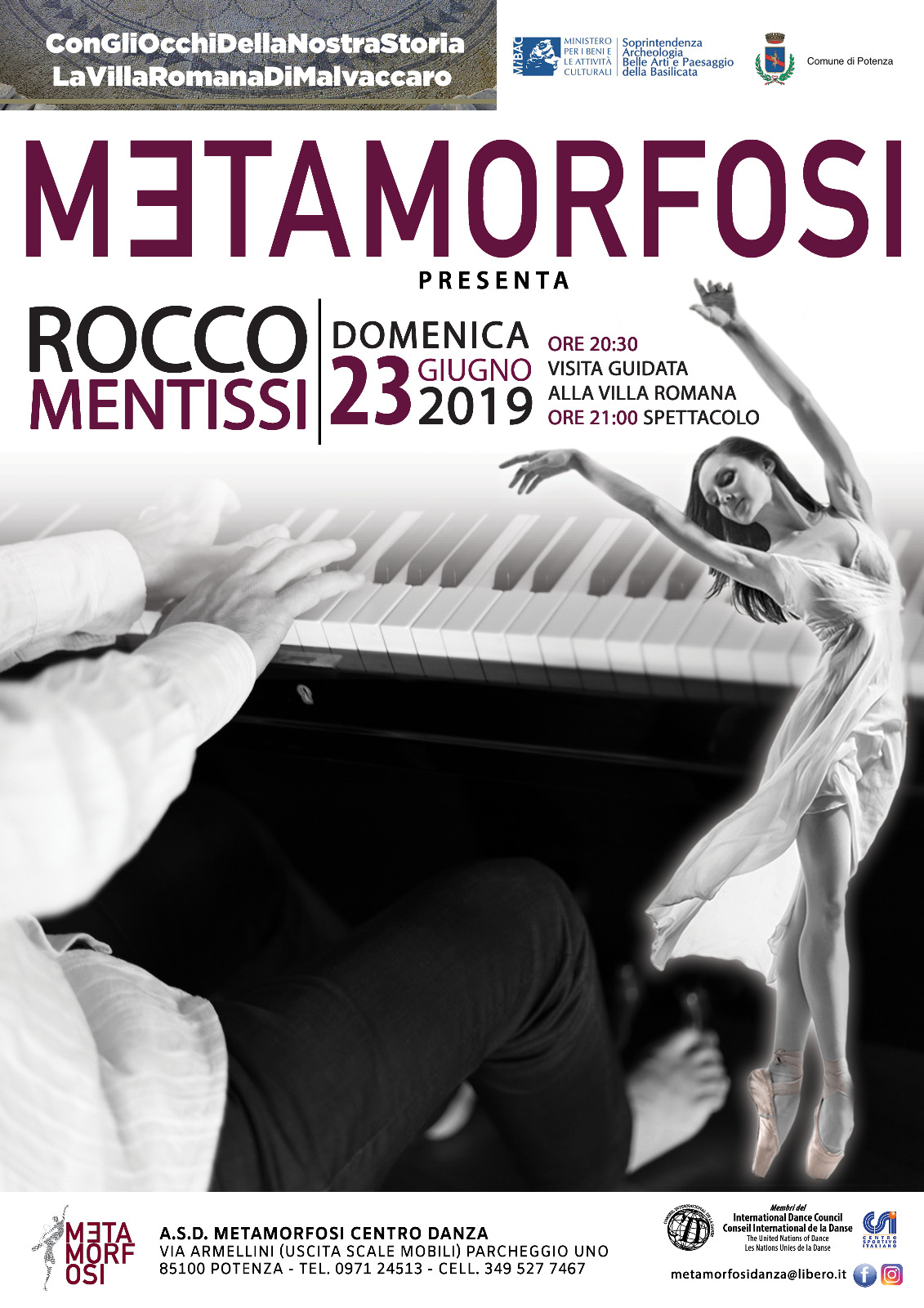 20 Giugno 2019 Metamorfosi Rocco MentissiDomenica 23 giugno 2019Villa Romana di Malvaccaro ore 20.30: visita guidataore 21.00: spettacolo LocandinaDownload